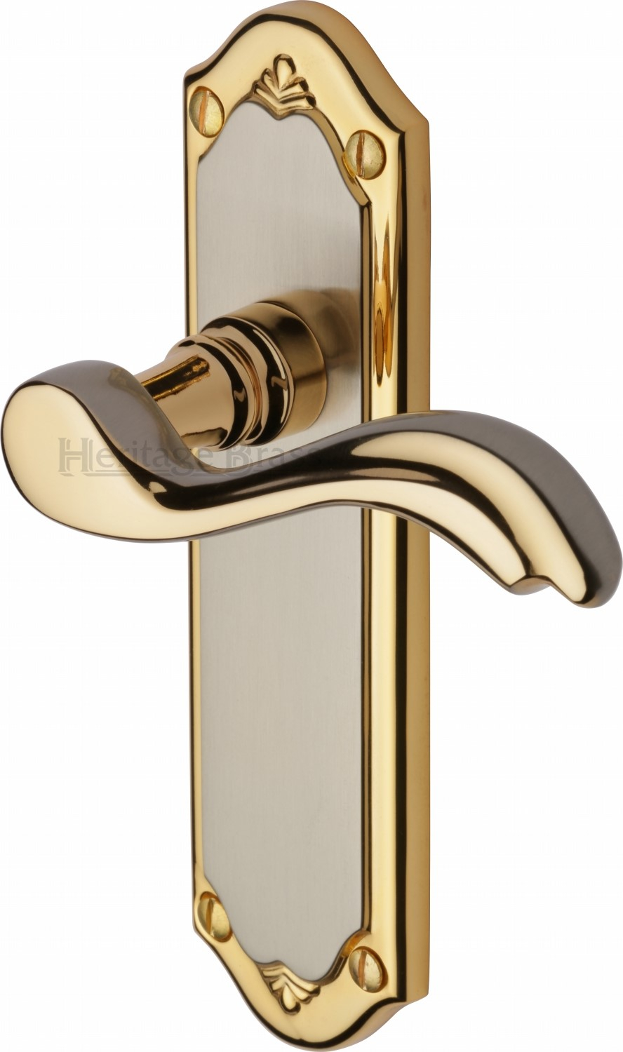 The Lisboa has a traditional style backplate and a fancy, detailled lever handle. It is available in 7 different finishes, including the Jupiter finish- Satin Nickel with a Gold edge.